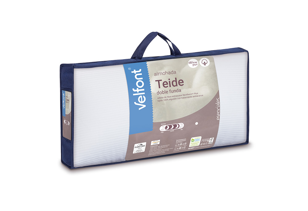 La almohada Teide está confeccionada con relleno de fibra Neotherm® Plus, una exclusiva fibra hueca siliconada y conjugada, extrafina y muy suave al tacto. Es una fibra muy esponjosa que goza de una gran capacidad de recuperación.