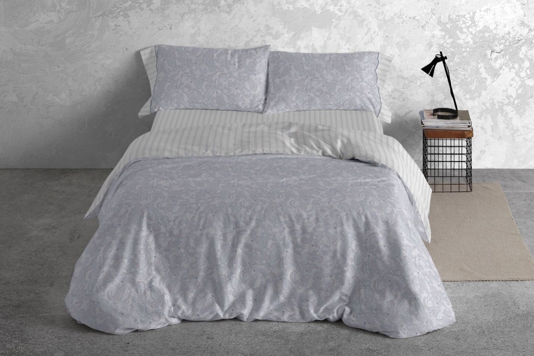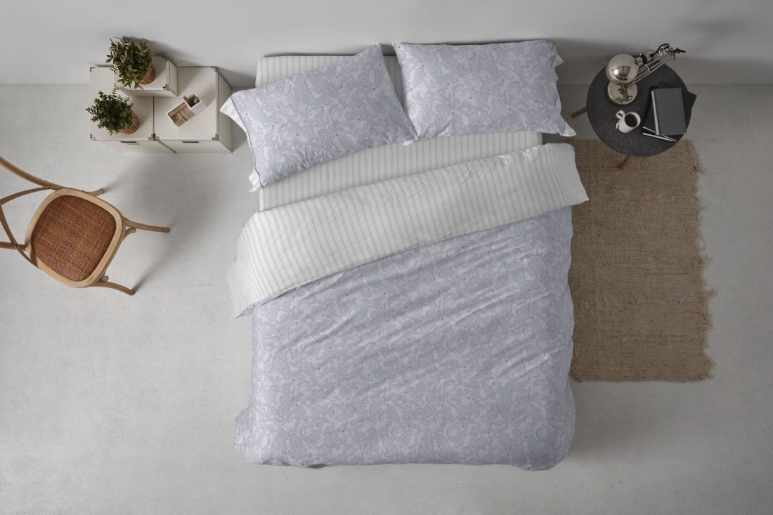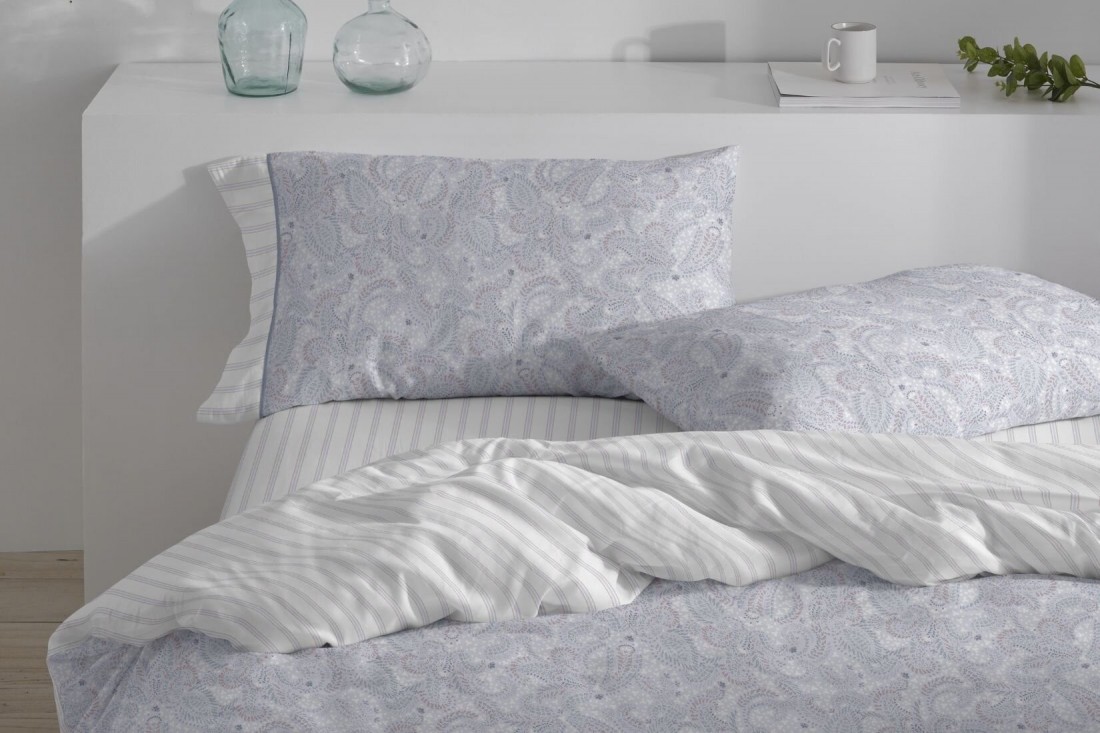 Juego de Funda Nórdica con un elegante estampado estilo paisley con motivos de puntitos, en tonos azules, granate y blanco. Reverso estampado con rayas y finos pespuntes en azul y granate sobre fondo blanco. Almohada con el mismo diseño que la tapa, con aplicación de la bajera. Bajera confección ajustable , con el mismo diseño que el reverso.