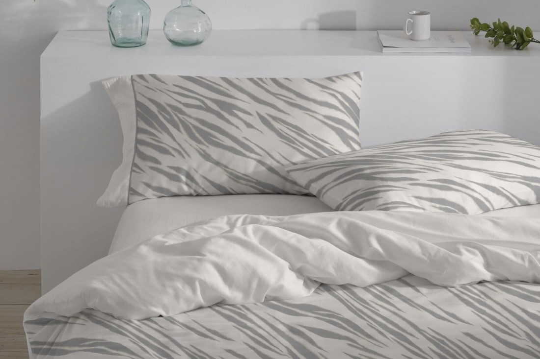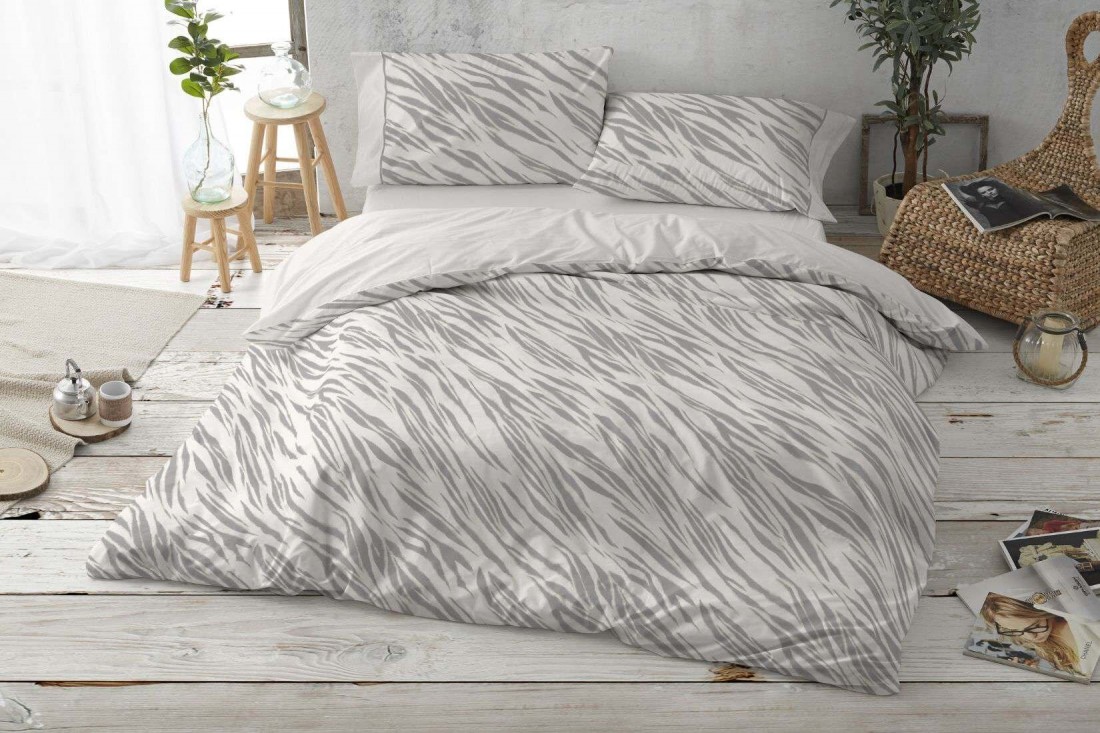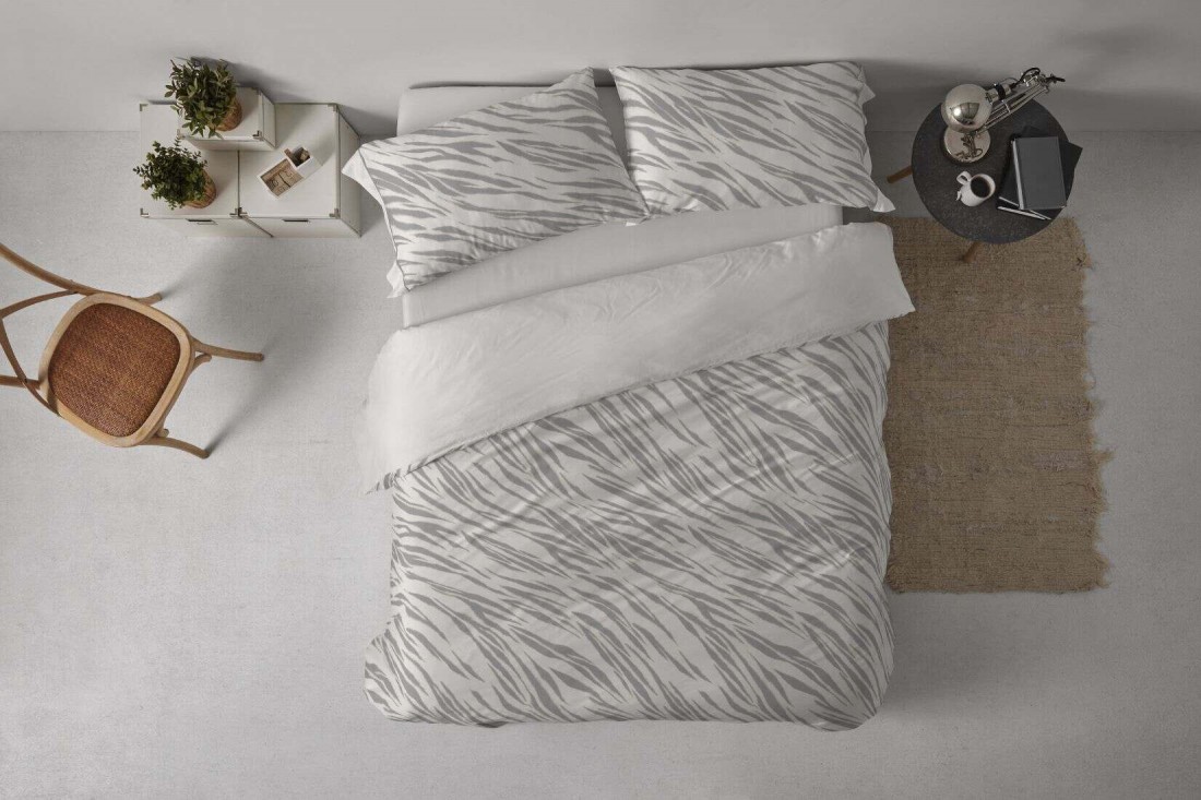 Este juego de funda nórdica se inspira en el concepto Animal Print, una expresión de diseño atemporal que versiona la riqueza de las pieles de los animales para infundir sofisticación y carácter. Presenta un patrón de franjas irregulares, con contornos delicadamente difuminados. En tono acero sobre un fondo crudo. El reverso de la funda, la bajera ajustable y las aplicaciones de la almohada son en color crudo. Un ribete en tono acero adorna las bocas de la almohada. Un juego ideal para un dormitorio vanguardista y natural.