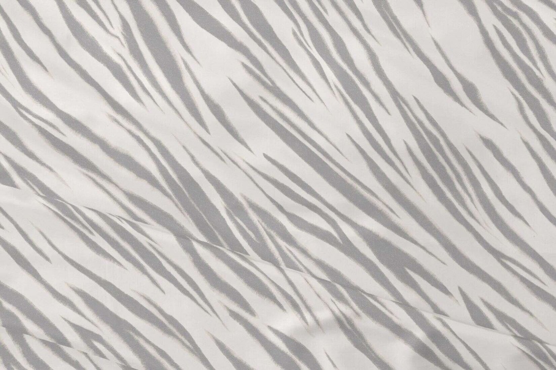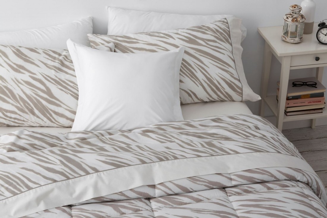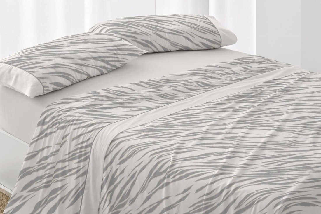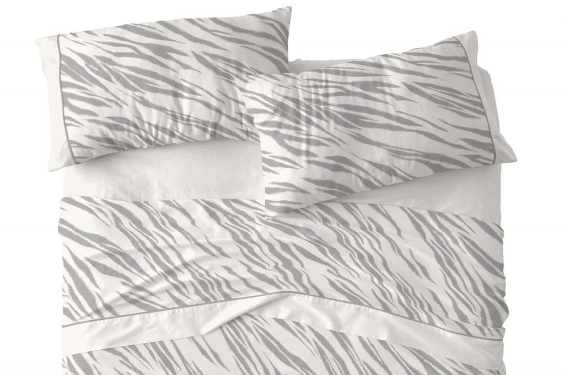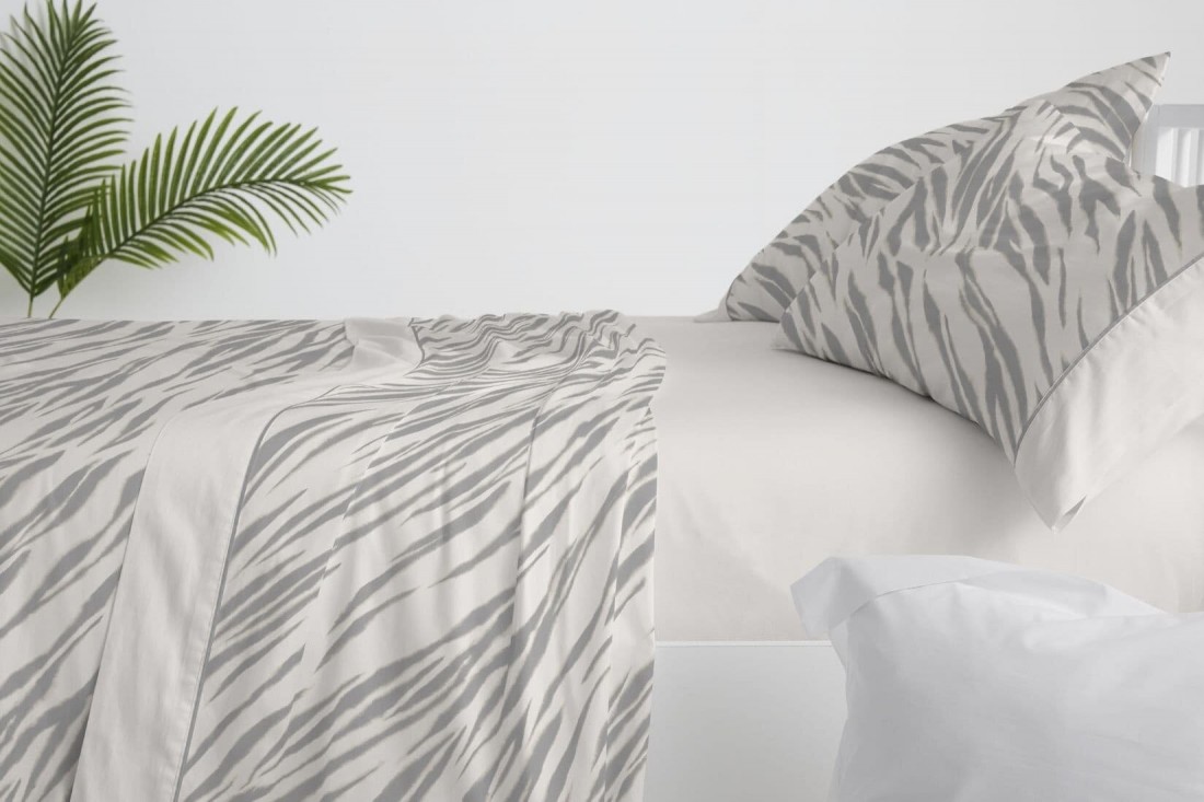 Juego de sábanas de estampado Print Animal, imitando un dibujo de piel de cebra de contornos difuminados, en tono acero sobre fondo crudo. La sábana bajera ajustable y las aplicaciones de los embozos en tono crudo. Un ribete en tono acero adorna la almohada. Estética Neo-Wild, que busca devolver la naturaleza al diseño de interiores o la moda, en este caso, a la ropa de cama.