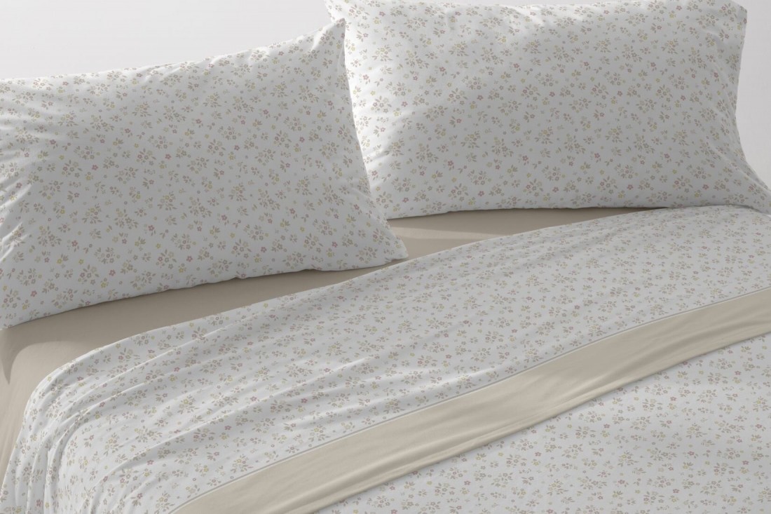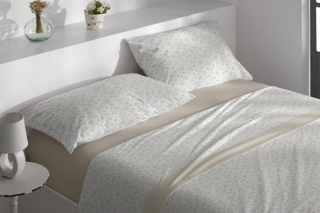Sábanas Velvelina® de Burrito Blanco. En este modelo, se distinguen por su diseño floral provenzal, con pequeñas flores y hojas en tonos beige, ocre y teja sobre fondo blanco. Aportan calidez a la ropa de cama de invierno. Su tacto aterciopelado asegura un descanso confortable y envolvente. La sábana bajera y el embozo en beige completan el conjunto.