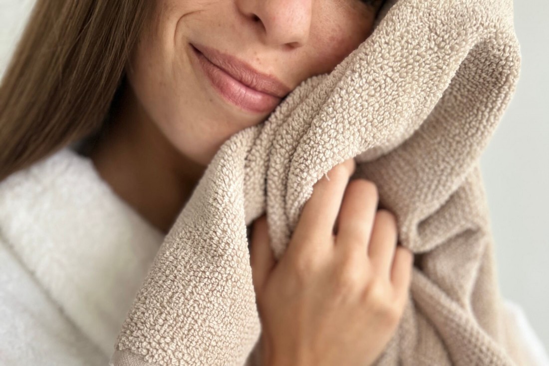 Una toalla de maquillaje de 30×50 cm; una toalla de manos de 50×100; una toalla de baño de 100×150 cm.
