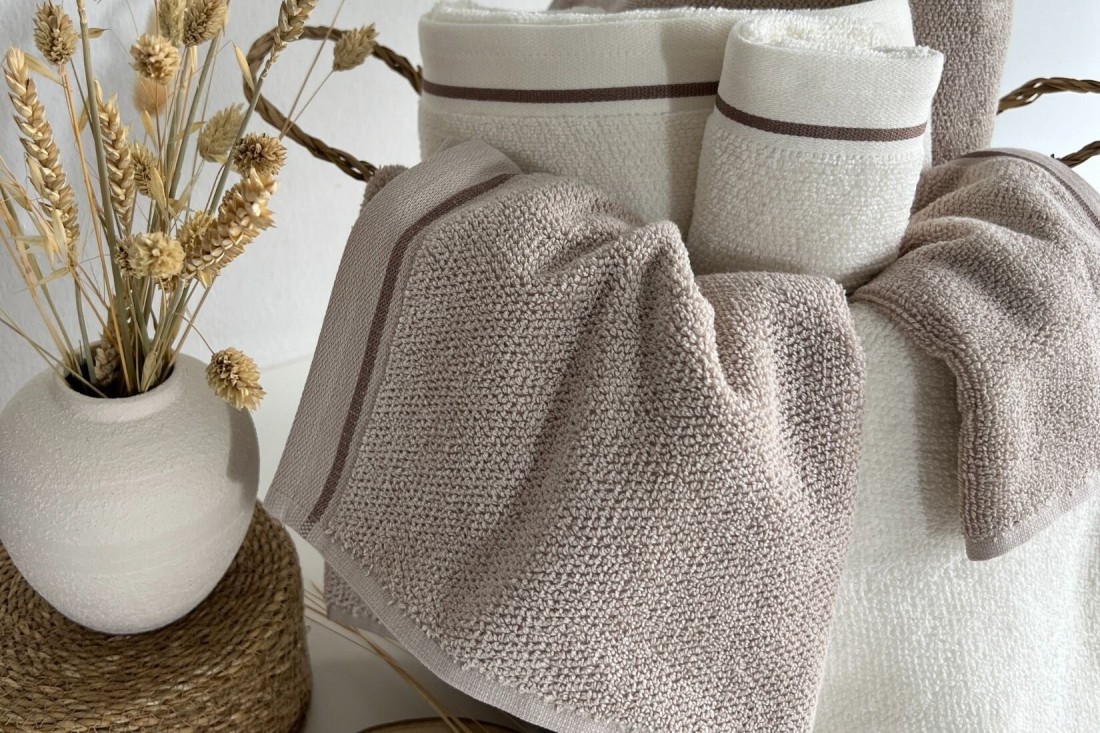 Juego de toallas en tres medidas diferentes, en color beige con cenefa lisa en color beige y raya en color chocolate.